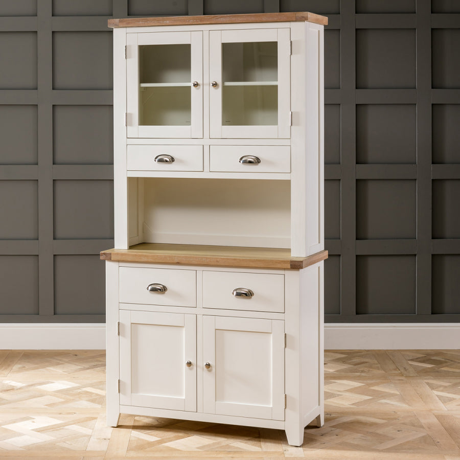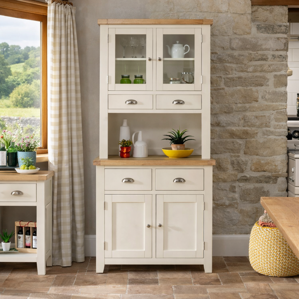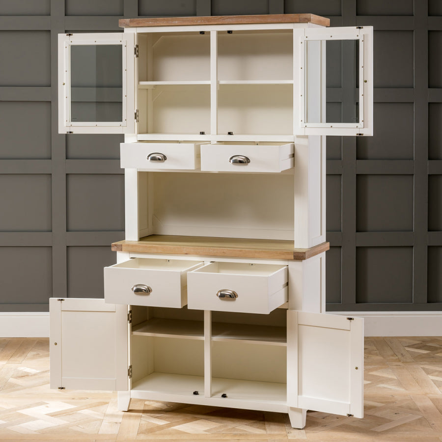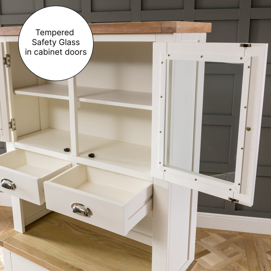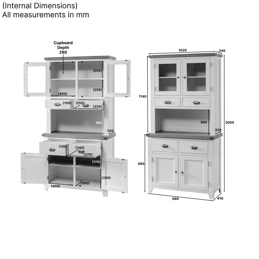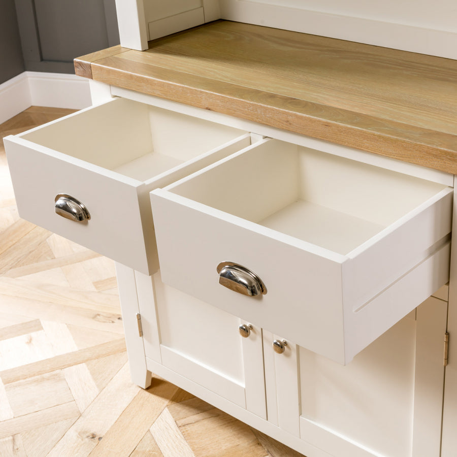 The Cain Kitchen Storage Cupboard is crafted with a solid oak frame, guaranteeing strength and durability. The top dresser cupboard features a fixed internal shelf and two drawers, providing organized storage for items such as dinnerware, glassware, or cooking utensils. The sideboard base consists of two large drawers positioned over a large two-door cupboard. These drawers are spacious and smoothly glide on metal runners, ensuring easy access to stored items. Furthermore, the lower cupboard of the Cain Kitchen Storage Cupboard features an open shelf area with a fixed shelf, providing versatile storage solutions for items such as pots, pans, or small kitchen appliances.