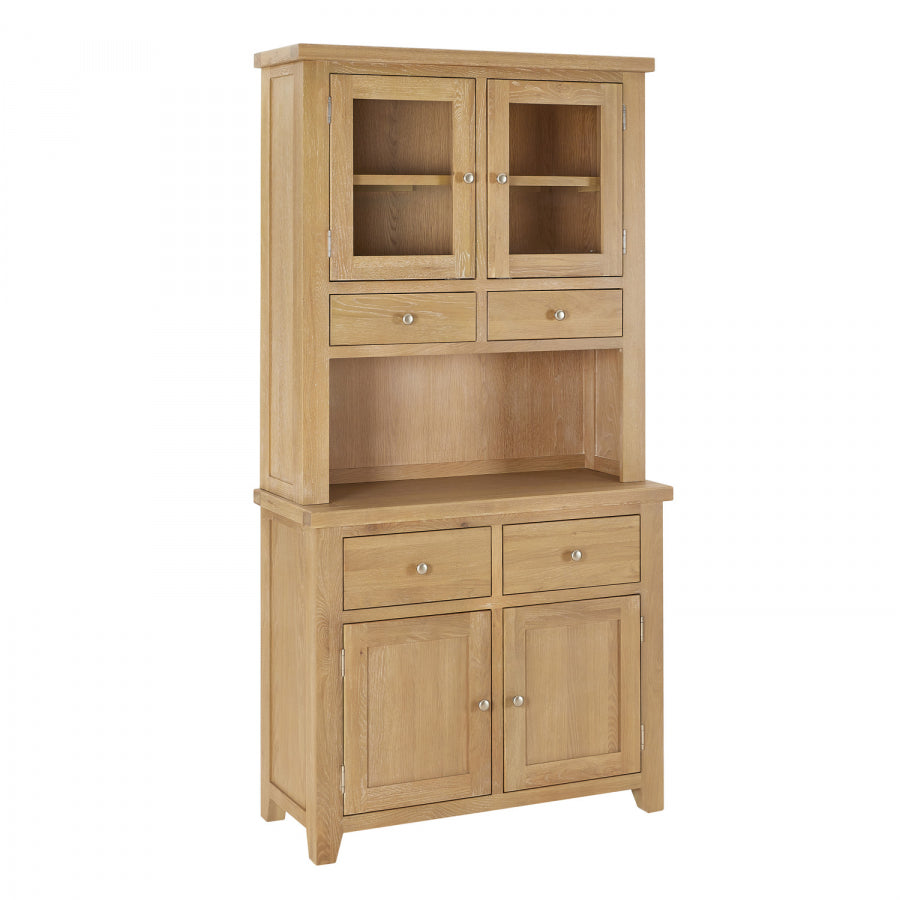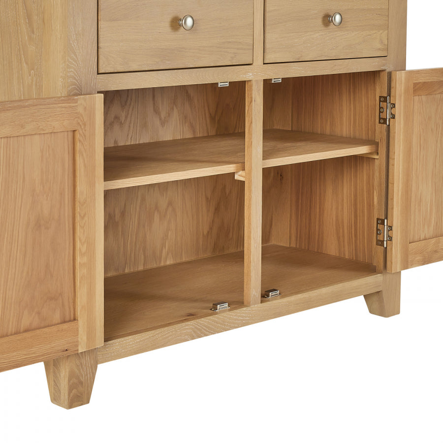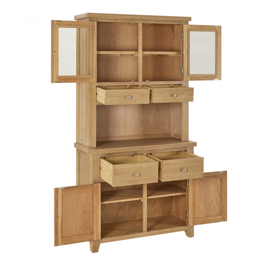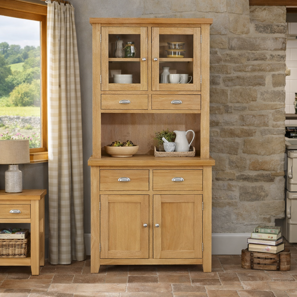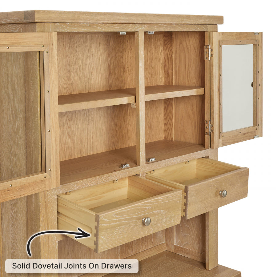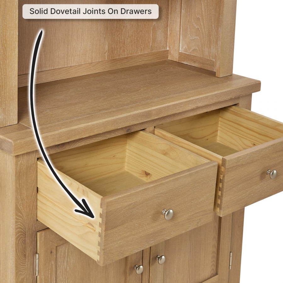 The Cain Kitchen Storage Cupboard is crafted with a solid oak frame, guaranteeing strength and durability. The top dresser cupboard features a fixed internal shelf and two drawers, providing organized storage for items such as dinnerware, glassware, or cooking utensils. The sideboard base consists of two large drawers positioned over a large two-door cupboard. These drawers are spacious and smoothly glide on metal runners, ensuring easy access to stored items. Furthermore, the lower cupboard of the Cain Kitchen Storage Cupboard features an open shelf area with a fixed shelf, providing versatile storage solutions for items such as pots, pans, or small kitchen appliances.