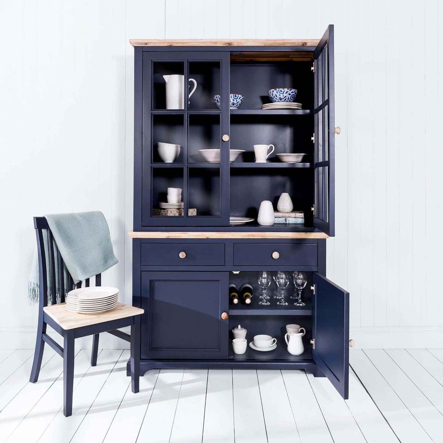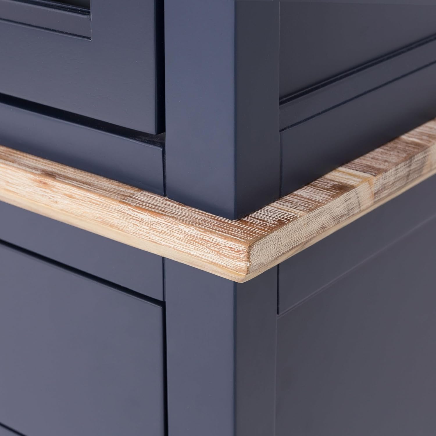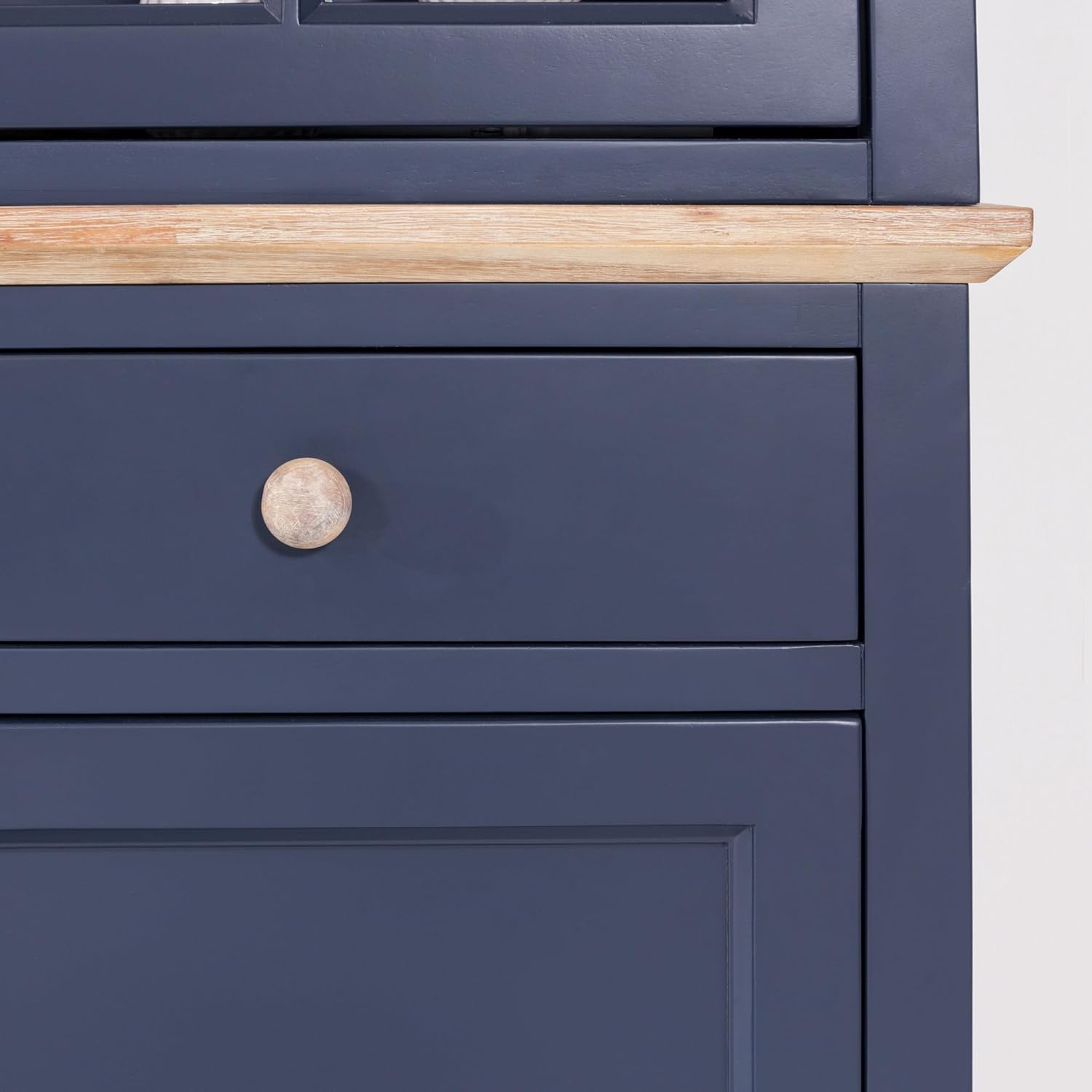 Bring a touch of timeless elegance and functionality to your home with the Clive Larder Cupboard - Navy Blue. Designed for both display and organization, this cabinet features a glass-door top with two shelves, perfect for showcasing your finest crockery, glassware, or collectibles. The lower cupboard with two drawers and a closed storage area provides ample space to neatly store tableware, linens, and other essentials. Finished in a sophisticated navy blue with a brushed acacia wood top, this piece effortlessly blends warmth, charm, and contemporary appeal—ideal for modern dining rooms, kitchens, or living spaces.