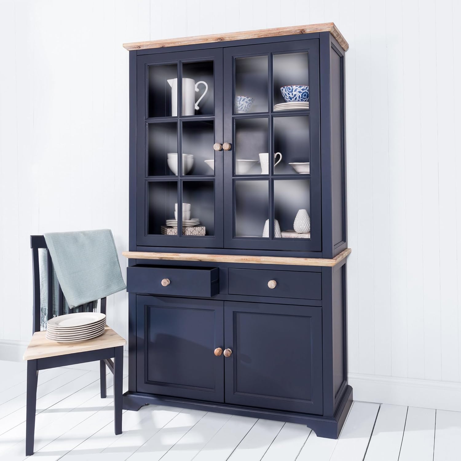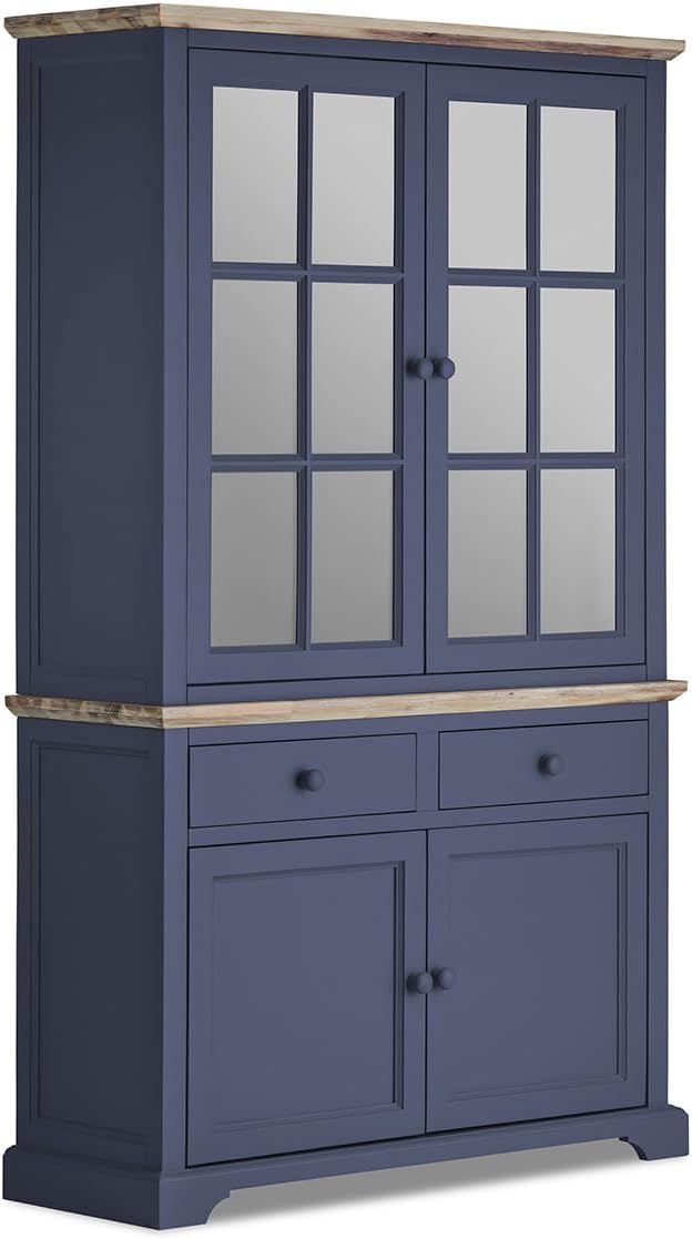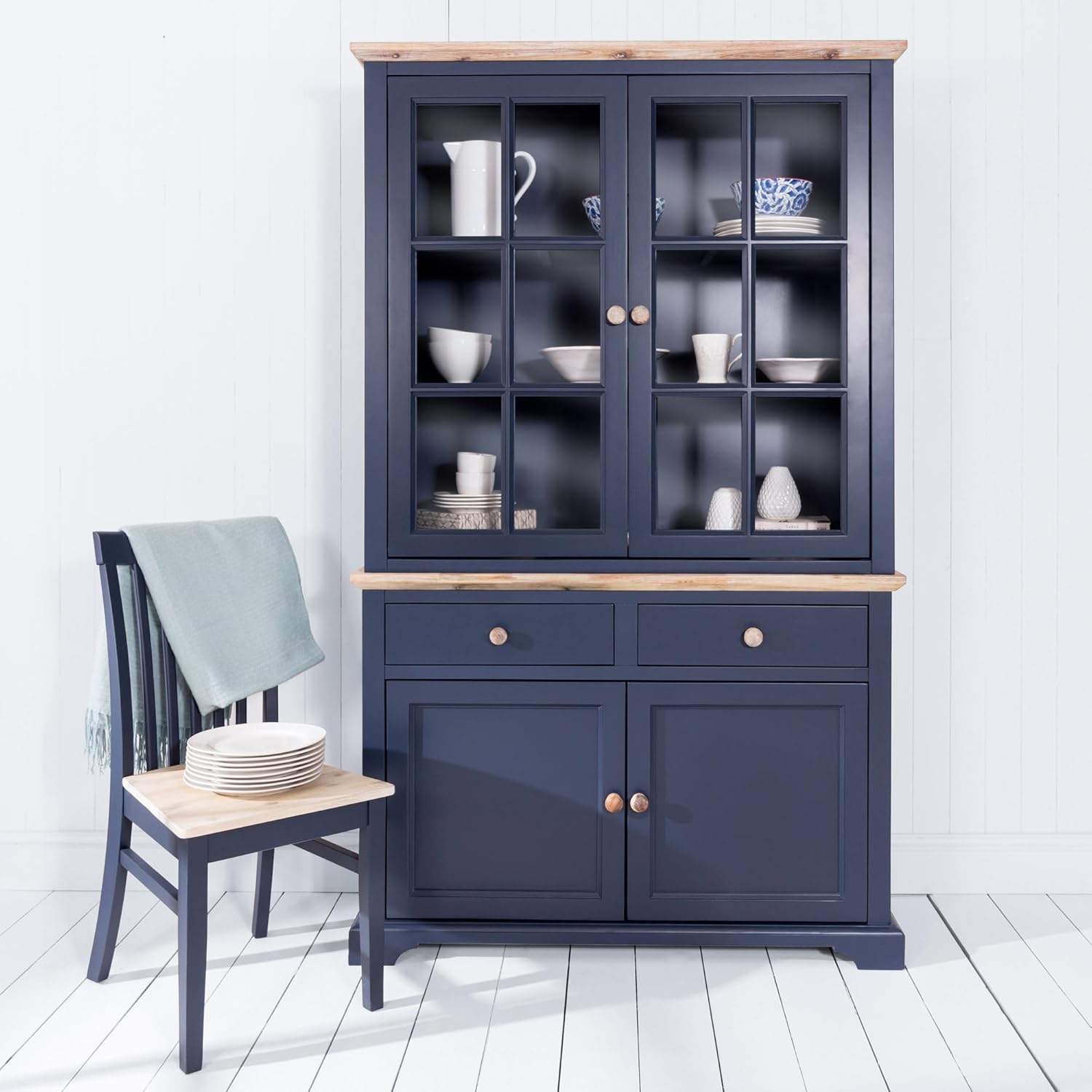 Bring a touch of timeless elegance and functionality to your home with the Clive Larder Cupboard - Navy Blue. Designed for both display and organization, this cabinet features a glass-door top with two shelves, perfect for showcasing your finest crockery, glassware, or collectibles. The lower cupboard with two drawers and a closed storage area provides ample space to neatly store tableware, linens, and other essentials. Finished in a sophisticated navy blue with a brushed acacia wood top, this piece effortlessly blends warmth, charm, and contemporary appeal—ideal for modern dining rooms, kitchens, or living spaces.