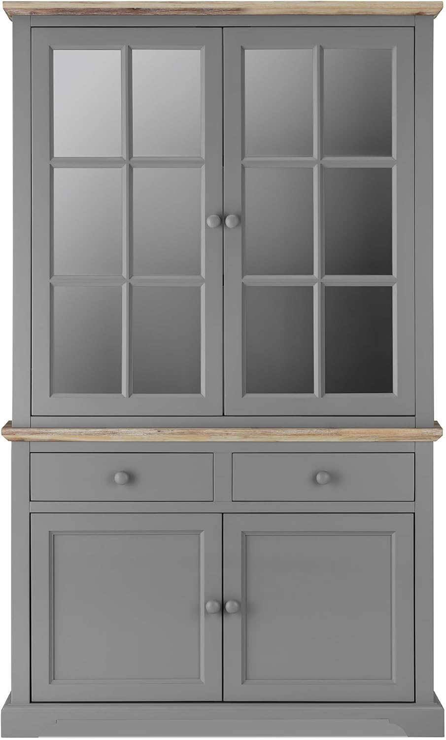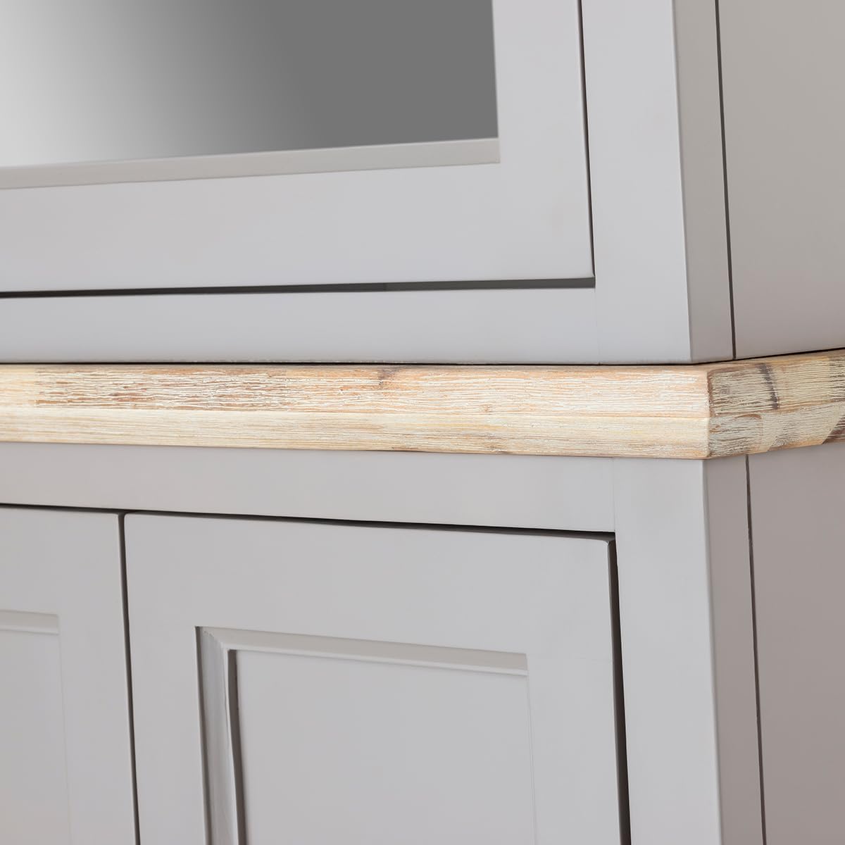 Bring a touch of timeless elegance and functionality to your home with the Clive Larder Cupboard - Dove Grey. Designed for both display and organization, this cabinet features a glass-door top with two shelves, perfect for showcasing your finest crockery, glassware, or collectibles. The lower cupboard with two drawers and a closed storage area provides ample space to neatly store tableware, linens, and other essentials. Finished in a sophisticated dove grey with a brushed acacia wood top, this piece effortlessly blends warmth, charm, and contemporary appeal—ideal for modern dining rooms, kitchens, or living spaces.