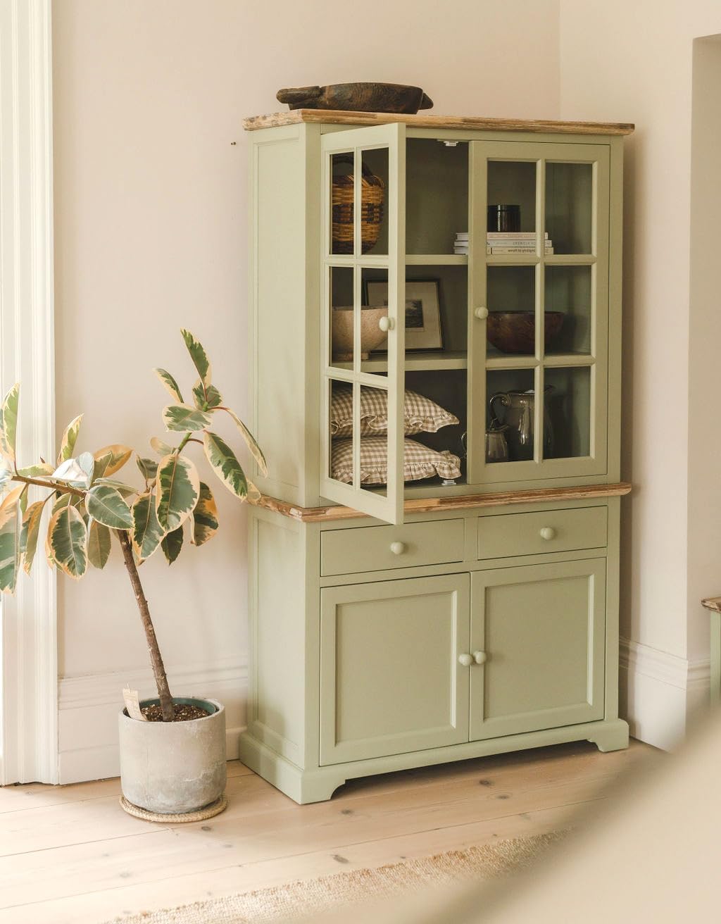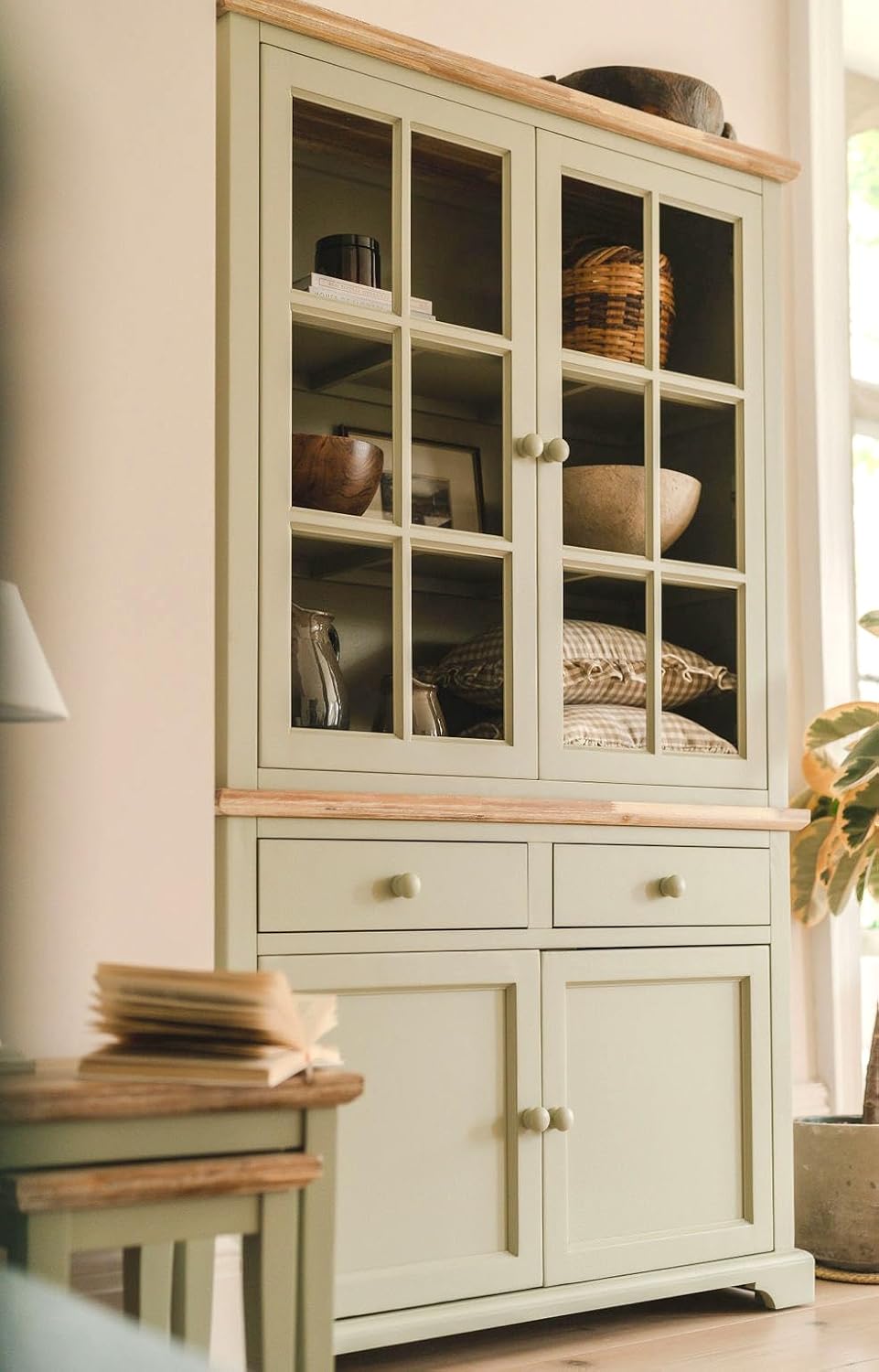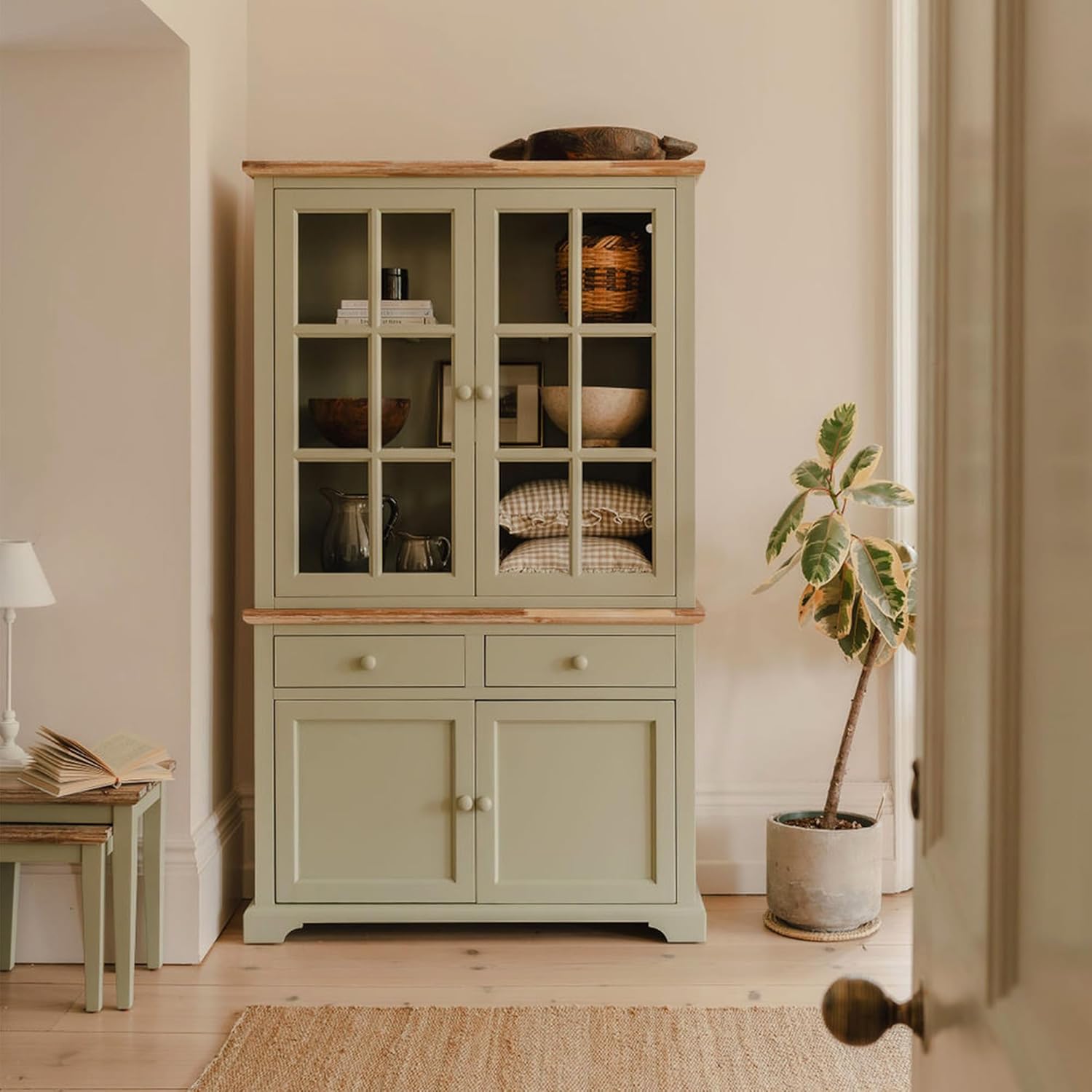 Bring a touch of timeless elegance and functionality to your home with the Clive Larder Cupboard - Sage Green. Designed for both display and organization, this cabinet features a glass-door top with two shelves, perfect for showcasing your finest crockery, glassware, or collectibles. The lower cupboard with two drawers and a closed storage area provides ample space to neatly store tableware, linens, and other essentials. Finished in a sophisticated sage green with a brushed acacia wood top, this piece effortlessly blends warmth, charm, and contemporary appeal—ideal for modern dining rooms, kitchens, or living spaces.