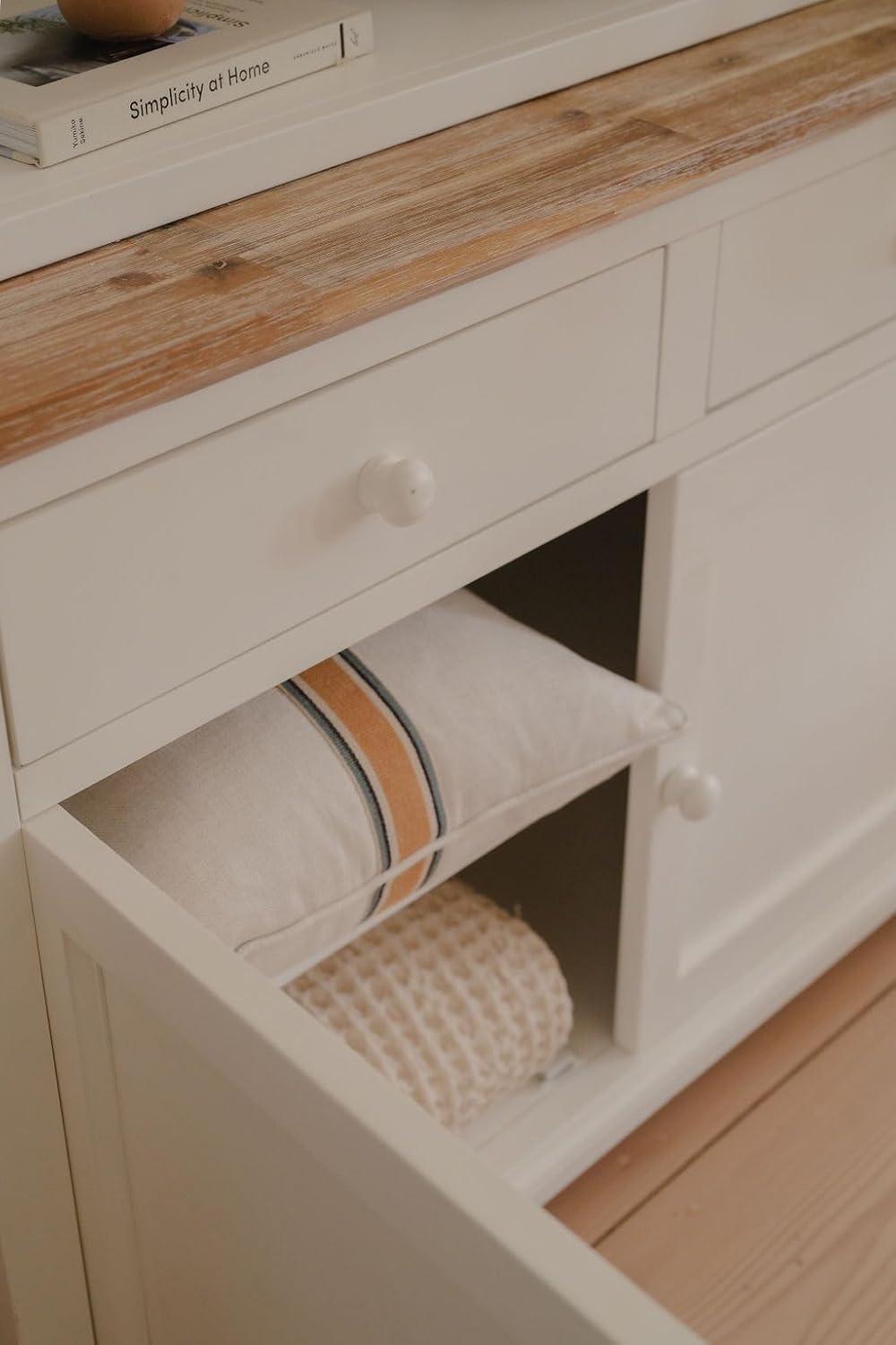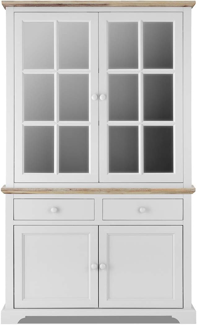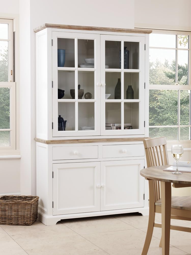 Bring a touch of timeless elegance and functionality to your home with the Clive Larder Cupboard - White. Designed for both display and organization, this cabinet features a glass-door top with two shelves, perfect for showcasing your finest crockery, glassware, or collectibles. The lower cupboard with two drawers and a closed storage area provides ample space to neatly store tableware, linens, and other essentials. Finished in a sophisticated White with a brushed acacia wood top, this piece effortlessly blends warmth, charm, and contemporary appeal—ideal for modern dining rooms, kitchens, or living spaces.
