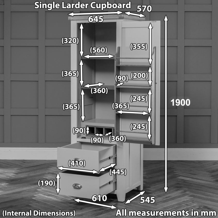 Without taking up a lot of floor space, the Ettal Kitchen Larder Pantry Cupboard offers plenty of storage for your food and beverages. Three open shelf spaces, including two completely height-adjustable oak shelves, can be configured to meet your storage needs in the upper cupboard area.