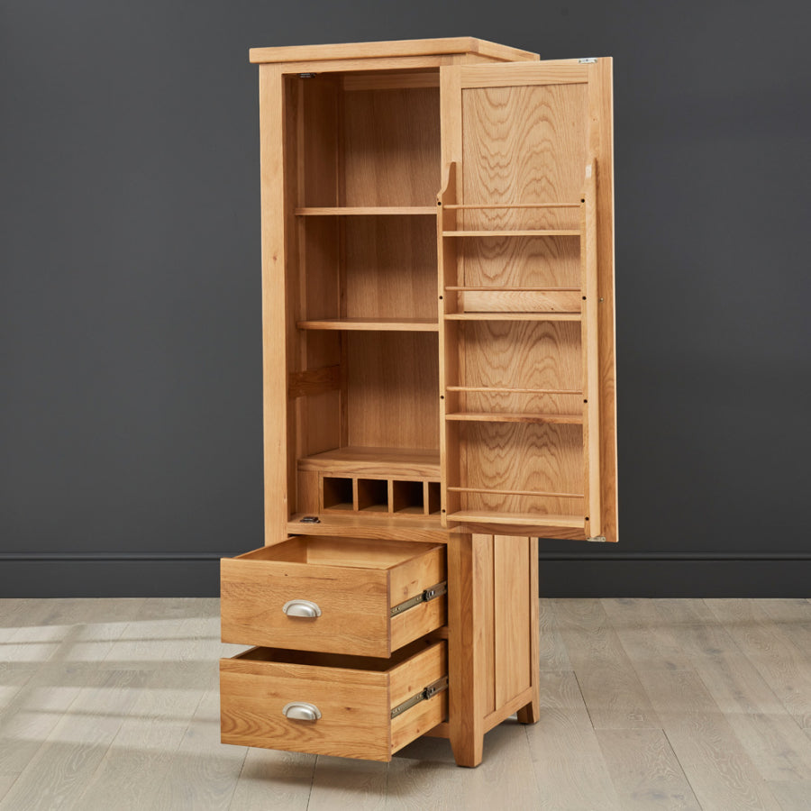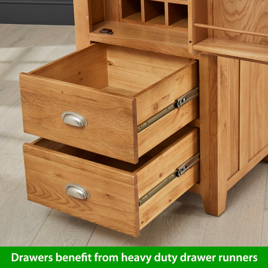 A four-bottle oak wine rack is located in the lower portion of the cabinet, and a four-shelf oak rack is located within the door and is ideal for holding jars, bottles, tins, and other containers. Two big drawers with telescopic drawer runners are included in the unit's lower portion, making it easy to open and close the drawers even when they are filled with heavy crockery.