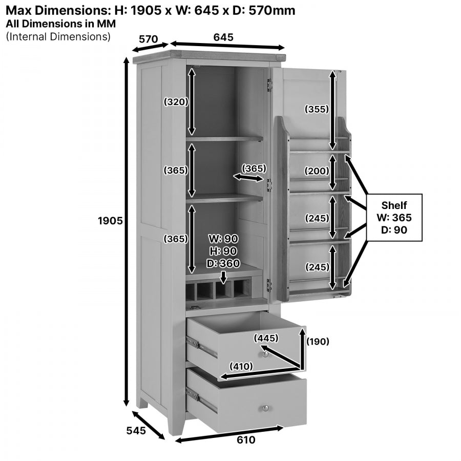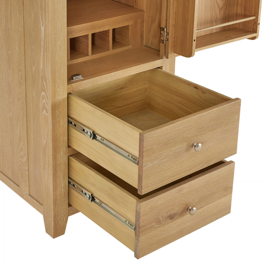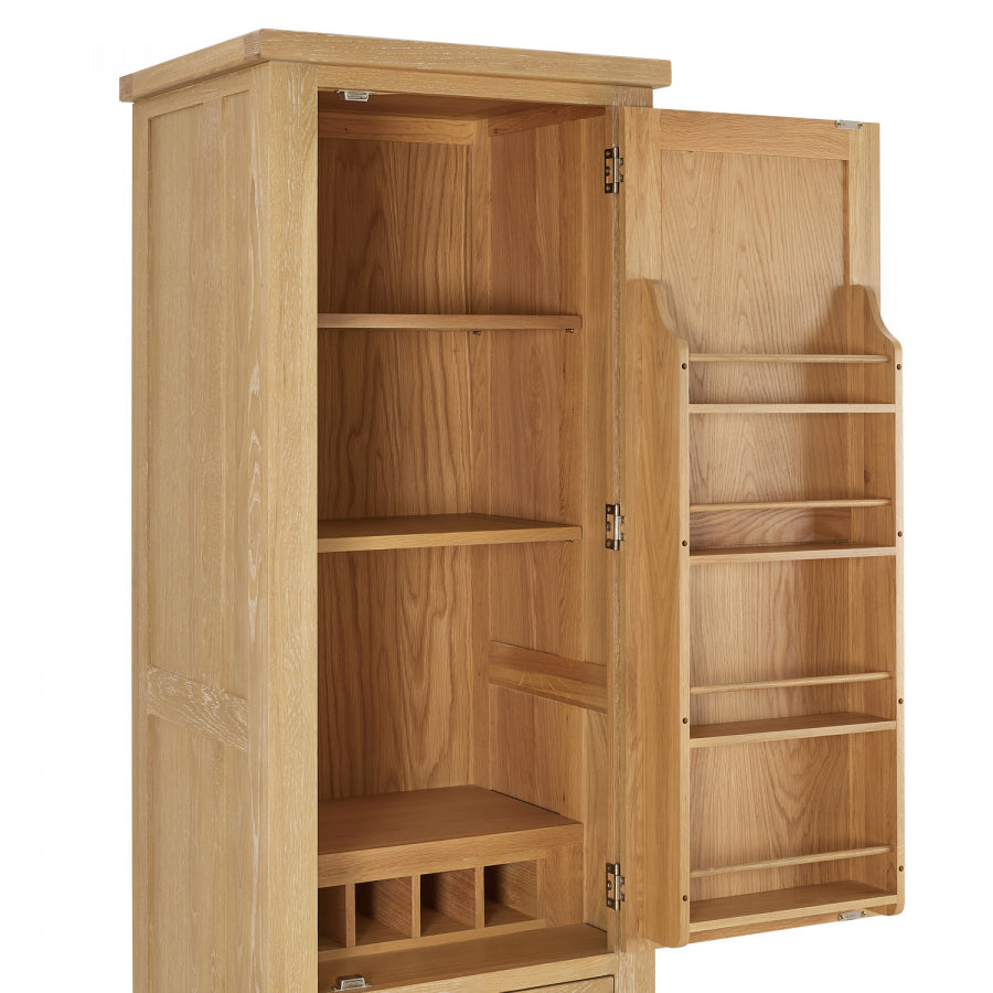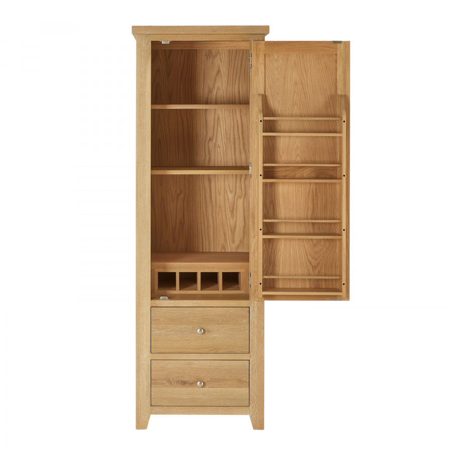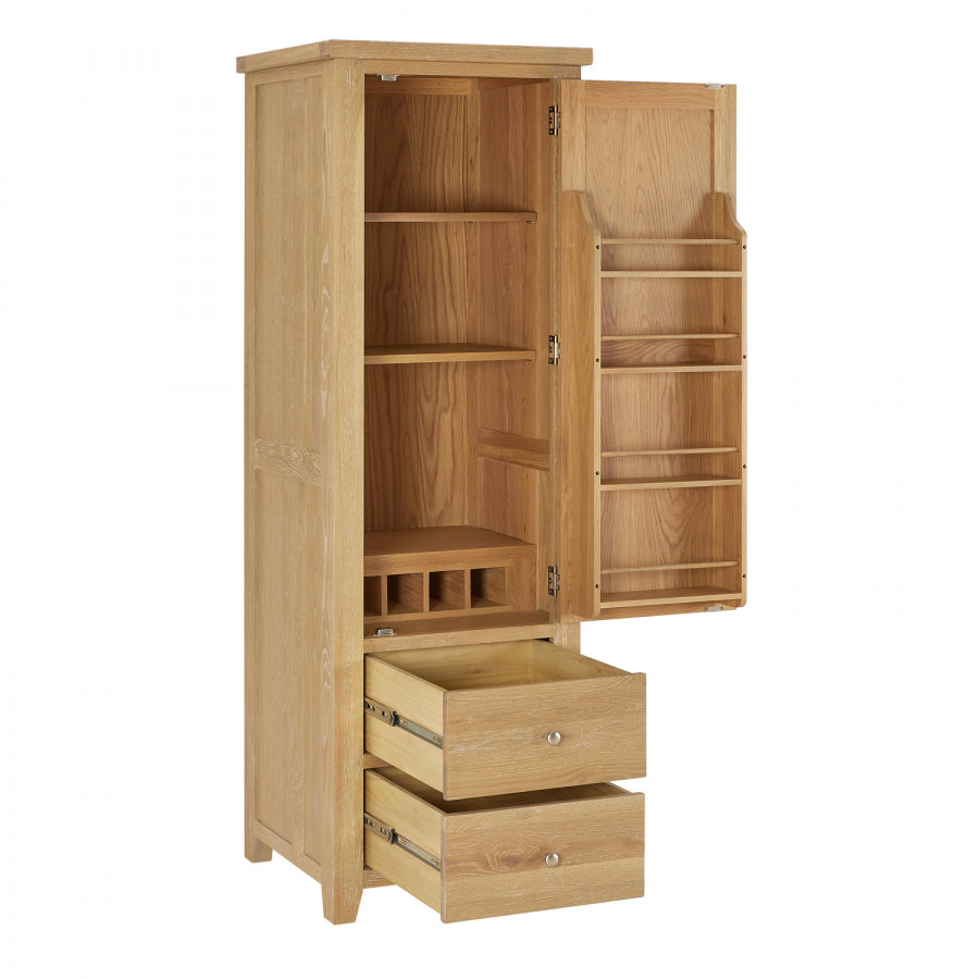 A four-bottle oak wine rack is located in the lower portion of the cabinet, and a four-shelf oak rack is located within the door and is ideal for holding jars, bottles, tins, and other containers. Two big drawers with telescopic drawer runners are included in the unit's lower portion, making it easy to open and close the drawers even when they are filled with heavy crockery.