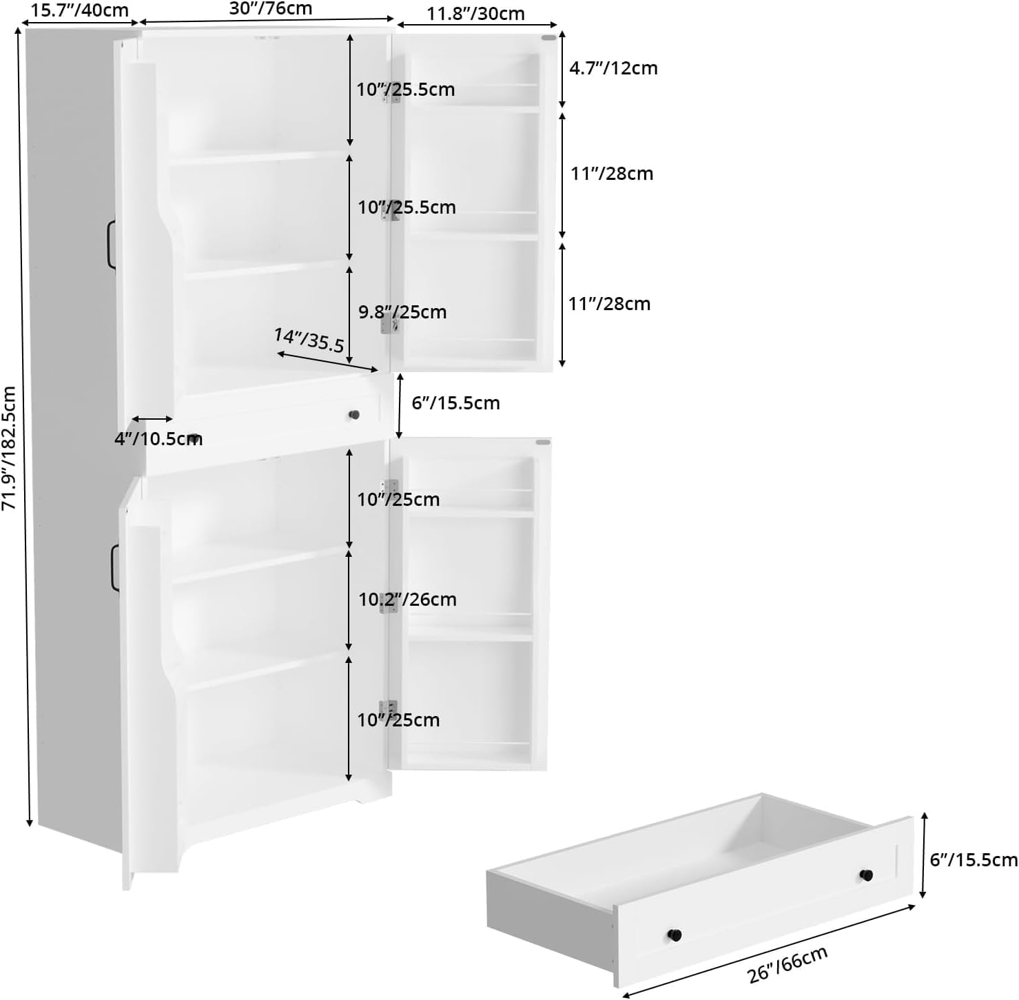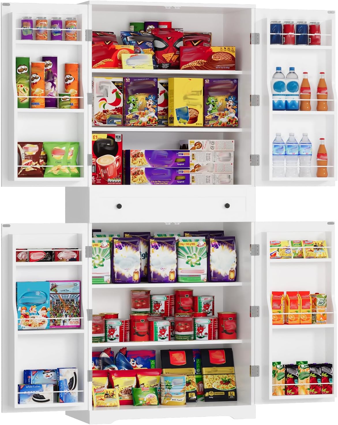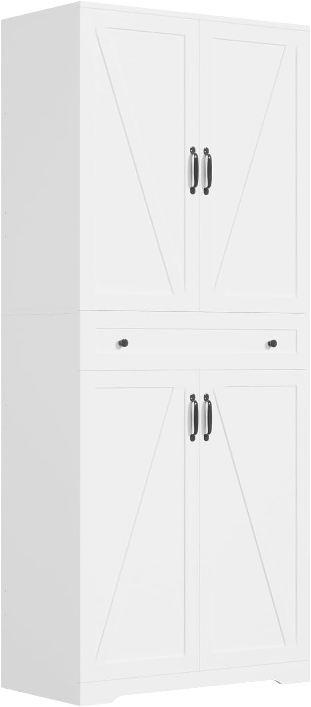 Elevate your kitchen organization with the Fen Tall Kitchen Storage Pantry Cupboard – White, a stylish and functional storage solution designed to keep your cooking space neat and efficient. Crafted with a modern farmhouse touch, this tall cabinet features four doors, a spacious pull-out drawer, and multiple adjustable shelves that allow you to customize storage for food, tableware, or small appliances.