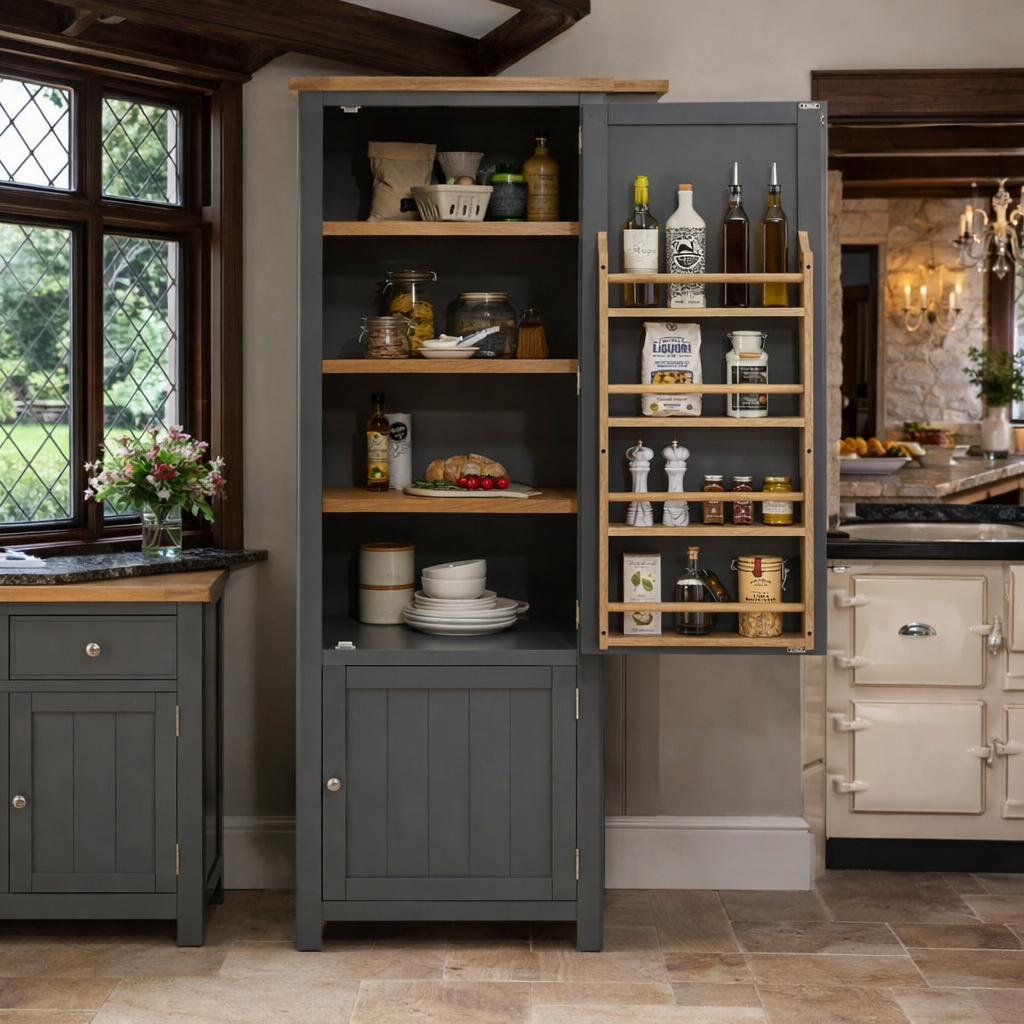 The upper section of the Micah Pantry features a door with four shelf racks, perfect for storing spices, condiments, and smaller kitchen items. Inside, you'll find three large internal shelves, ideal for storing bulkier items such as pots, pans, or dry goods. Each shelf is three-stage height adjustable, allowing you to customize the storage space to suit your needs.