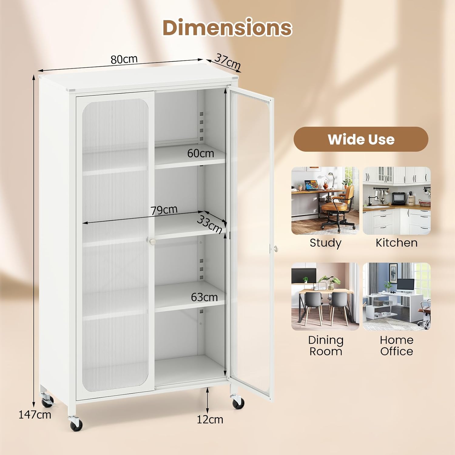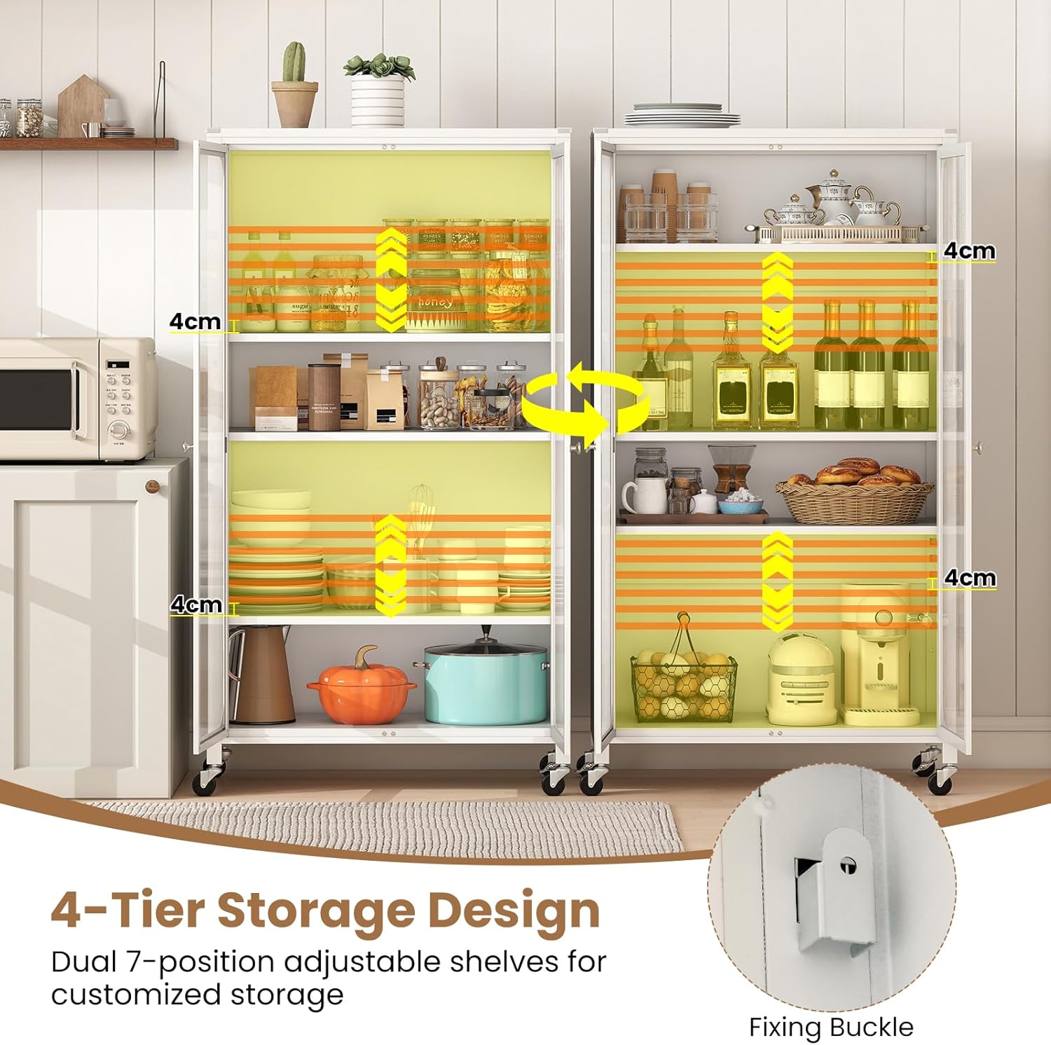 Built with a durable powder-coated metal frame and reinforced panels, the Tarian Trolley ensures long-lasting stability and support. It includes 7-position adjustable shelves that allow you to customize the interior to suit your needs—perfect for storing items of various sizes. For added convenience, this trolley is equipped with smooth-rolling caster wheels, including two lockable ones for secure placement, along with anti-toppling and anti-collision features for enhanced safety. Combining mobility, durability, and elegant design, it’s a versatile addition to any kitchen, office, or living space.