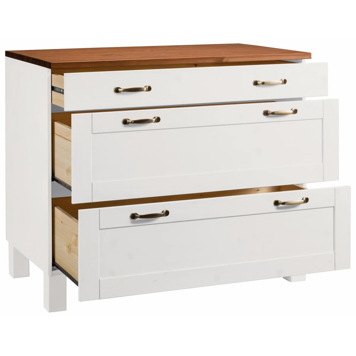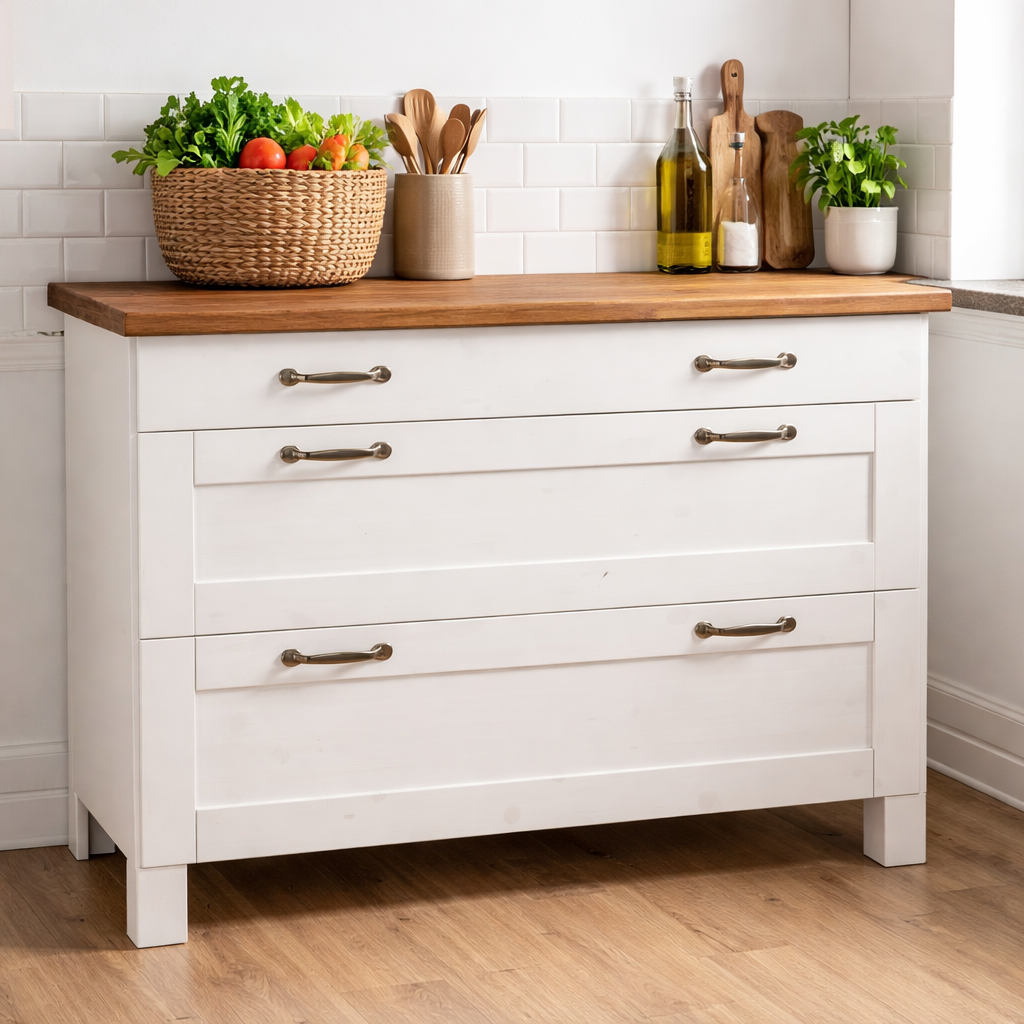 With its contemporary yet useful design, the Ruedi Pantry Cupboard will be a lovely addition to your space. This elegant pantry cabinet has a beautiful white, honey finish and is made of pine wood. A wide range of culinary utensils may be accommodated in the pantry cupboard's narrow drawer and two additional, roomy drawers, which offer lots of useful storage space and guarantee a cozy and organized arrangement.