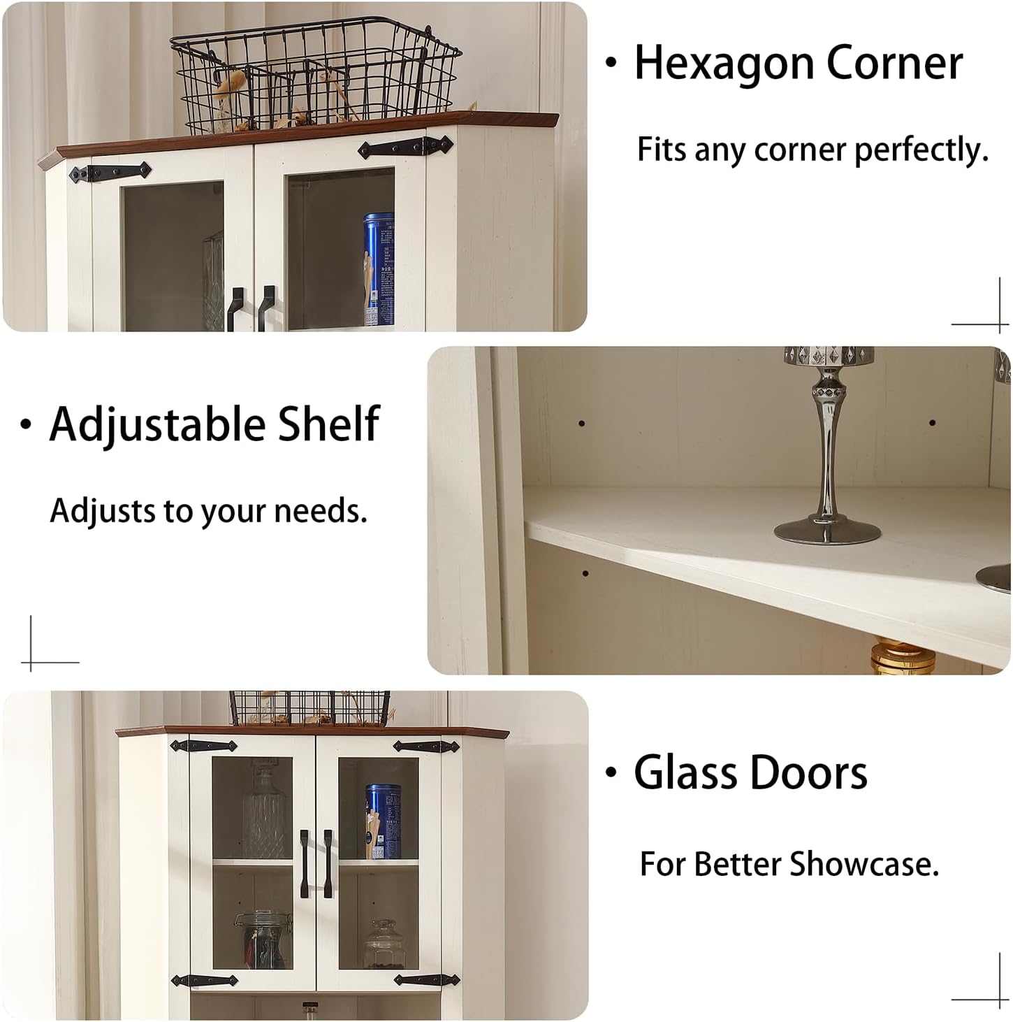 • Tempered glass doors beautifully showcase dishes, collectibles, or décor while keeping them protected from dust.