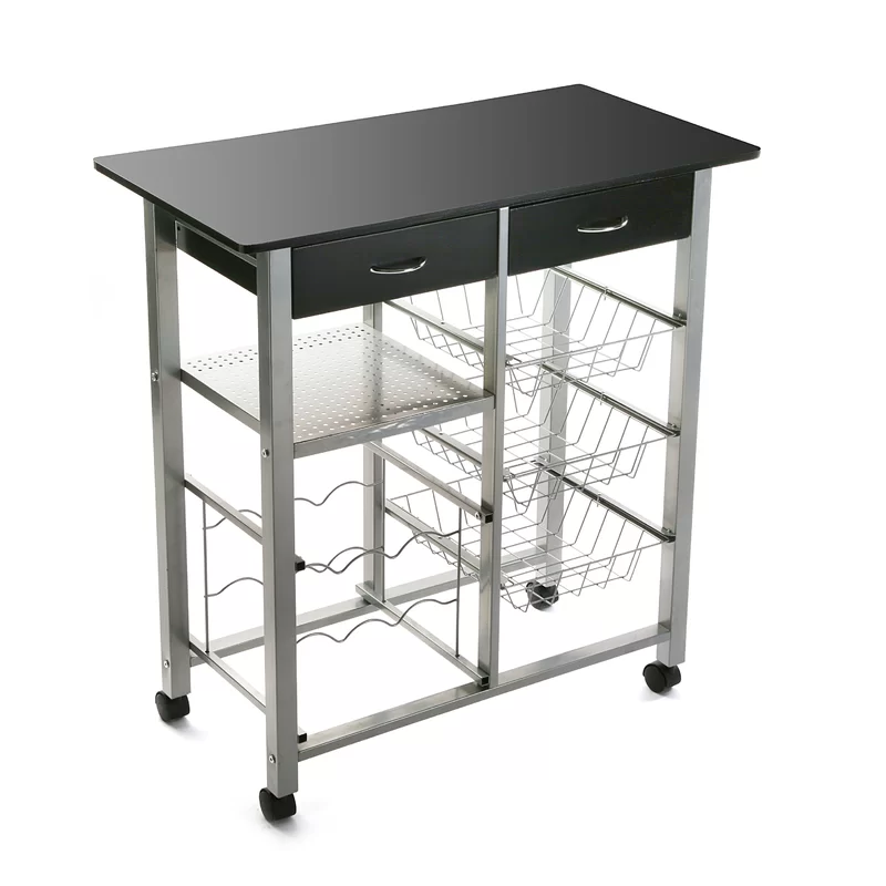 The Brito Kitchen Storage Trolley will make a great addition to your kitchen with it's modern yet practical design. This Kitchen Storage Trolley is constructed from stainless steel and plastic. The kitchen trolley showcases a spacious worktop with two drawers, four storage shelves and one wine rack. This Kitchen Storage is suited for any kitchen, restaurant, hotel or banquet hall.
