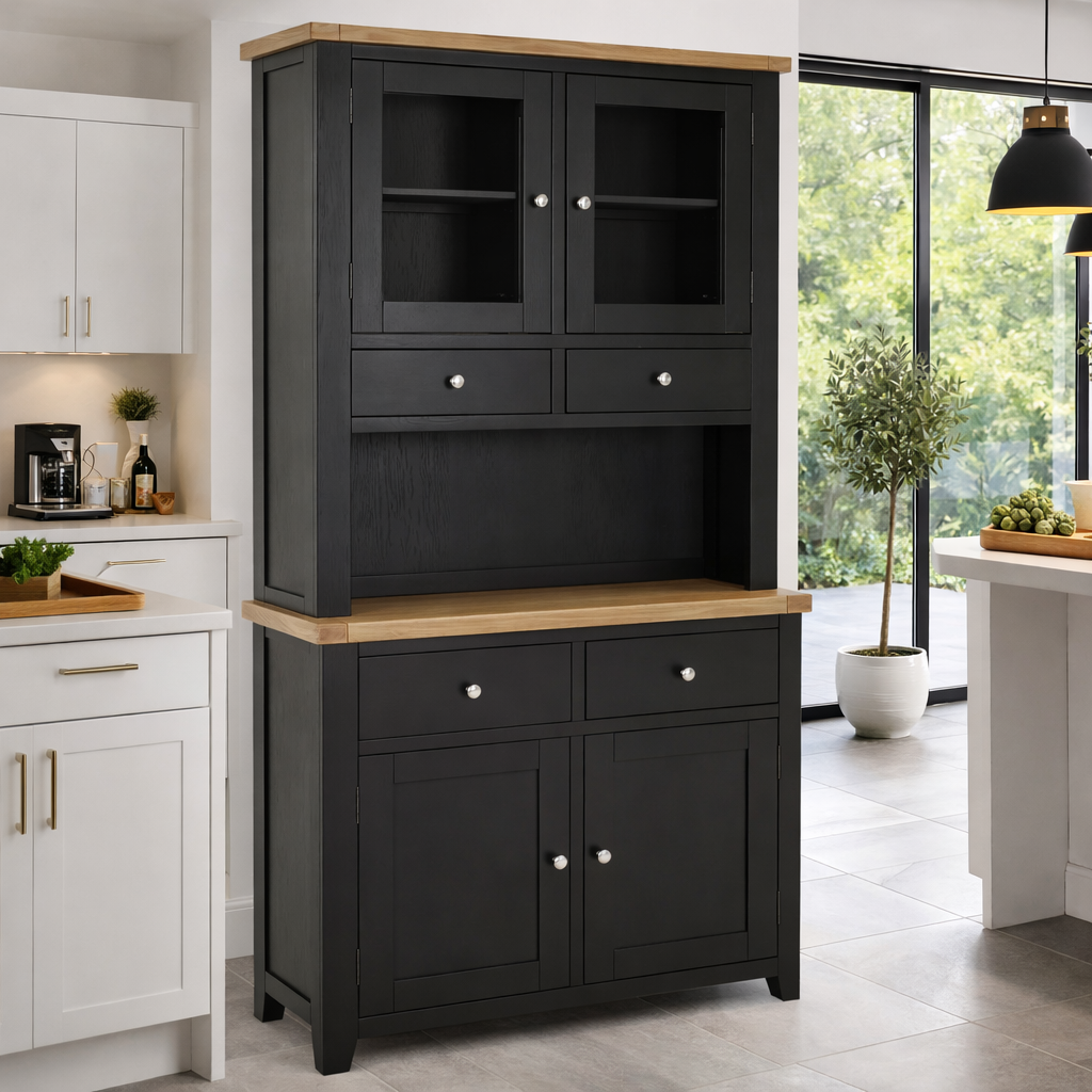 The Cain Kitchen Storage Cupboard is crafted with a solid oak frame, guaranteeing strength and durability. The top dresser cupboard features a fixed internal shelf and two drawers, providing organized storage for items such as dinnerware, glassware, or cooking utensils. The sideboard base consists of two large drawers positioned over a large two-door cupboard. These drawers are spacious and smoothly glide on metal runners, ensuring easy access to stored items. Furthermore, the lower cupboard of the Cain Kitchen Storage Cupboard features an open shelf area with a fixed shelf, providing versatile storage solutions for items such as pots, pans, or small kitchen appliances.