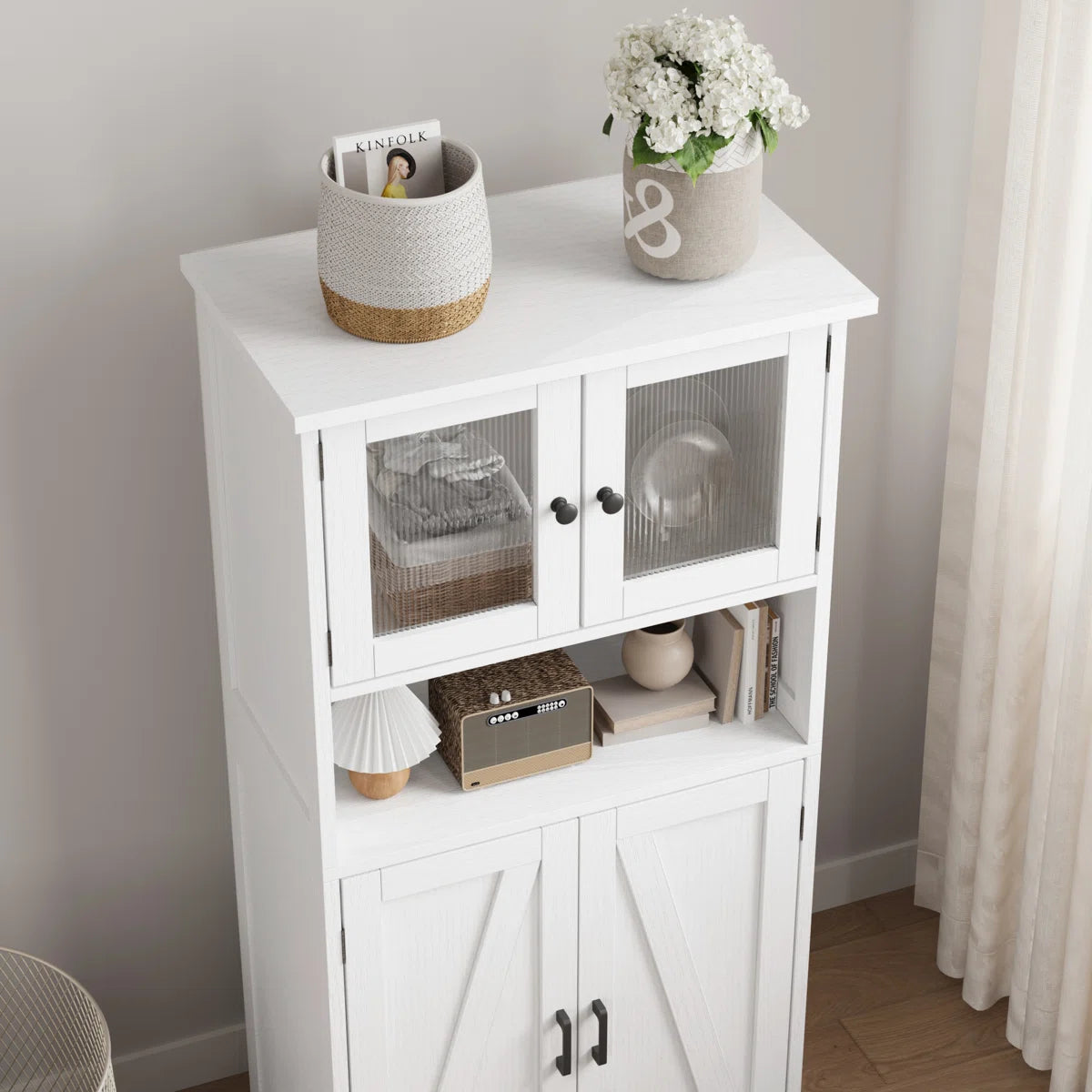 Designed for flexibility and functionality, this pantry cupboard offers ample storage to keep your essentials neatly organized. Whether used for storing dishes and cookware, displaying collections, or holding toiletries and linens, it combines beauty, durability, and convenience in one stylish piece.