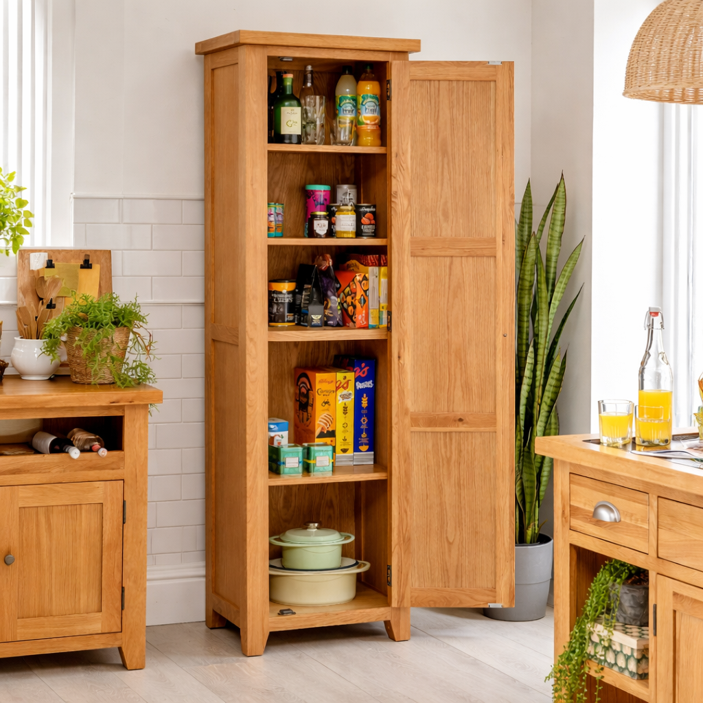 With its contemporary yet useful design, the Kareem Kitchen Storage Cupboard will be a lovely addition to your kitchen. This elegant freestanding kitchen storage cabinet is made of solid oak and has a stunning oak finish. The Kitchen Storage Cupboard offers five shelf areas that provide plenty of storage space.